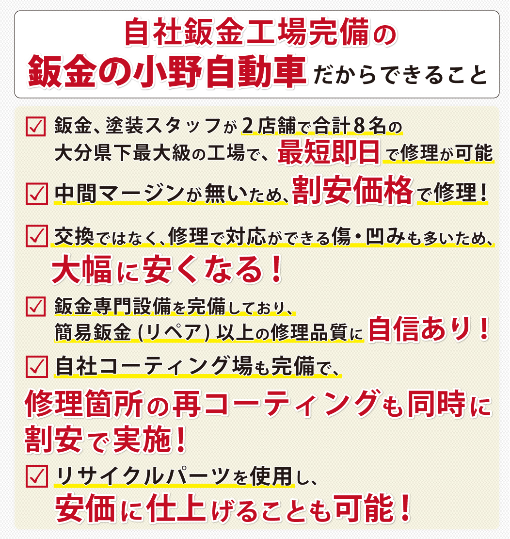 大分市・別府市・由布市・臼杵市・杵築市・日出町エリアのお客様のご要望に合せてキズ直し、鈑金・修理のお支払い方法をお選び頂けます。